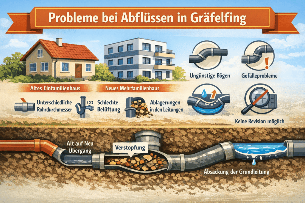 In Gräfelfing treffen wir häufig auf eine Mischung aus älteren Einfamilienhäusern mit nachträglich erweiterten Bädern und neueren Mehrfamilienhäusern mit langen Sammelleitungen. Beides verändert Strömung, Belüftung und Reinigbarkeit der Abwasserführung. Engstellen entstehen oft dort, wo Übergänge von Alt- auf Neubauteile mit unterschiedlichen Rohrdurchmessern verbunden wurden.