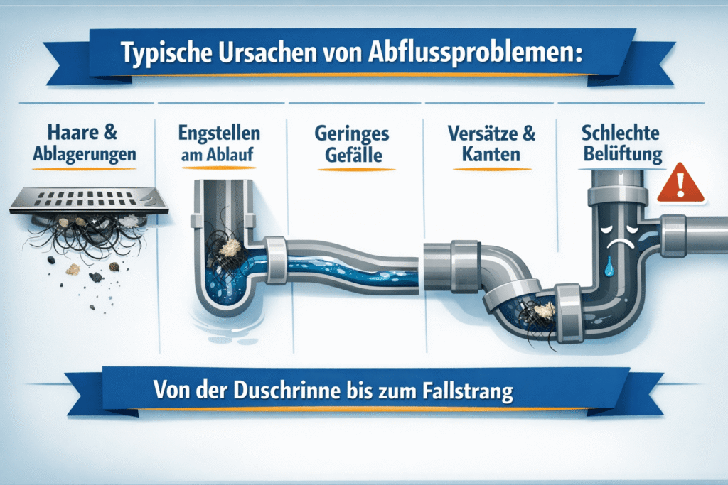 Wiederkehrende Störungen entstehen häufig nicht nur durch die Haarmenge, sondern durch eine Kombination aus Geometrie und Strömung. Im Objekt wirken Kanten an Ablaufkörpern, flache Gefälle und kleine Querschnitte wie Sammelpunkte, an denen sich Haare zuerst festsetzen und anschließend weitere Stoffe binden. Deshalb kann derselbe Haushalt unterschiedliche Problemstellen haben, obwohl die Nutzung gleich bleibt.
