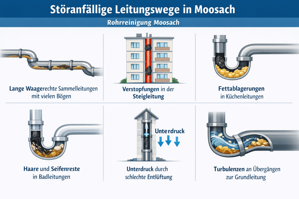 In Moosach sehen wir je nach Gebäudeart unterschiedliche Leitungsführungen, die den Abfluss entweder begünstigen oder bremsen. In Altbauten treffen wir häufiger auf lange horizontale Sammelleitungen mit vielen Richtungswechseln, während in Mehrfamilienhäusern die Steigleitung als gemeinsamer Übergabepunkt besonders empfindlich auf Fehlwürfe reagiert.